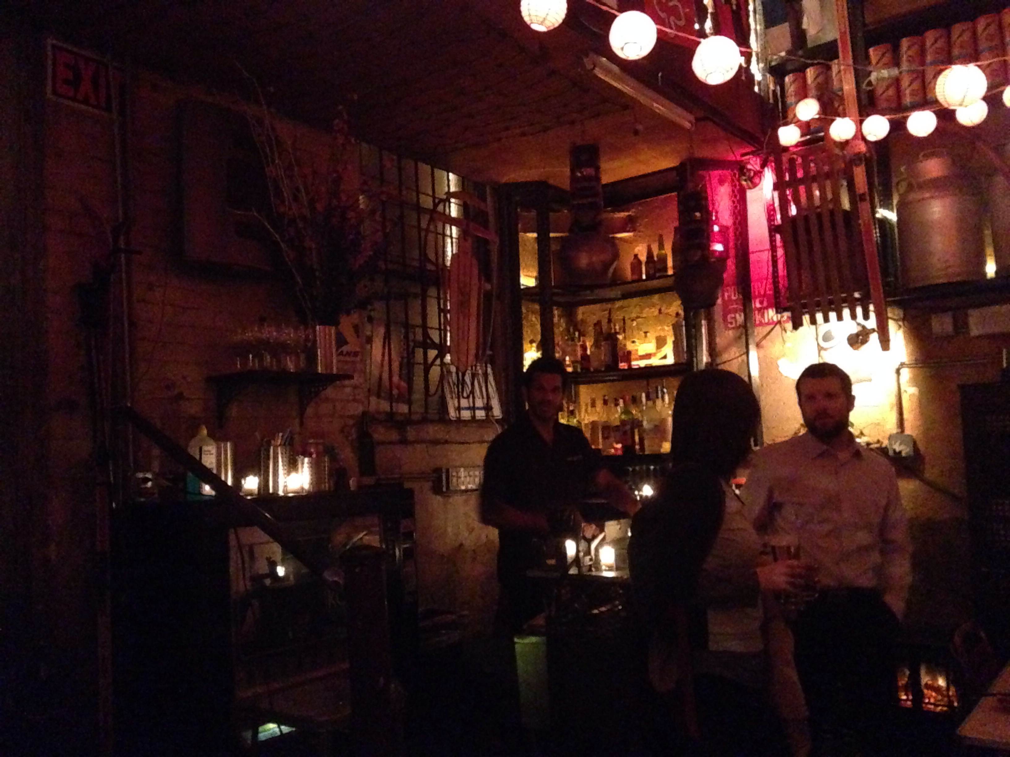 then down the long kitchen hallway, until we reached another heavy metal door, through which we emerged into a tiny back room decorated like a retro Swiss ski lodge. I tried to take photos but it was way too dark and way too cramped and this is the best I could do.