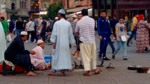 Having completed my whirlwind tour in the nick of time, I slowed down the pace and headed to Jemaa El-Fna Square, which was sort of like 1,001 Arabian Nights come to life. All previous evidence to the contrary, I am actually quite into historical sites… but only when I can form a picture in my mind of a human being from that time inhabiting the space. This was easy to do in the square, because I had read that the snake charmers, cross-dressing belly-dancers, and monkey trainers performing there had been plying their trade in this way for almost a thousand years. Aside from the soccer jersey adorning the monkey, everyone looked exactly how I’d expect them to have looked in, say, 1286. That really captured my imagination.