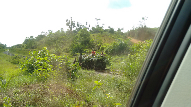 We bumped our way down uneven dirt roads that served as the major / only thruway and watched in awe for five minutes / sat in boredom for two hours as our driver macheted a new path out of the roadside jungle, to get us around two trucks that had sunk a foot deep on a stretch of road turned to mud by a torrential downpour.