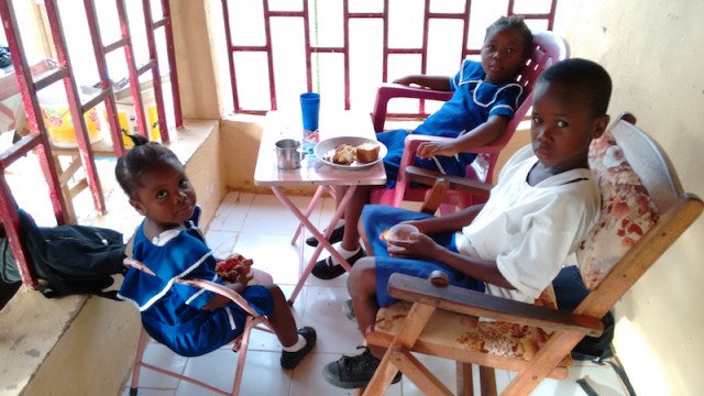 Here are some kids in their school uniforms having breakfast in a little shop next door to that building.