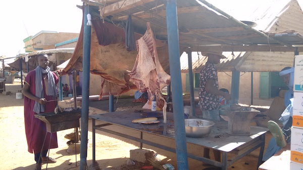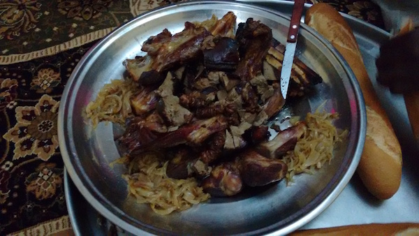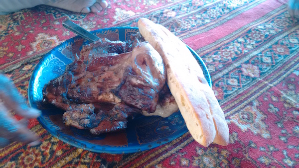 But then we took our seats on the carpet behind the shop and I realized that it was actually a restaurant and the big hunk of meat hanging out front was to be our lunch.