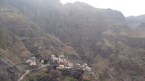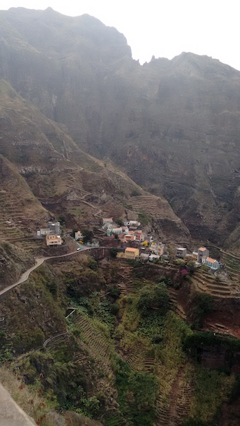 Speaking of locals… I was huffing and puffing my way up a crazy winding incline when I spotted these two ladies ahead of me, casually chatting and slowly but seemingly effortlessly making their way up the same hill I was having so much trouble with. (It may not look that steep here, but note the place where you can’t see the path any longer. That’s because it descends at like a 45 degree angle from there.) It turns out the woman on the left is the women on the right’s mother. An old lady carrying a bag on her head was in laughably better shape than me. I don’t feel that bad about it because I’m not actually in bad shape. Rather, the people of Santa Antão are in superhuman shape from a lifetime of climbing up and down hills in flimsy shoes while balancing stuff on their heads.