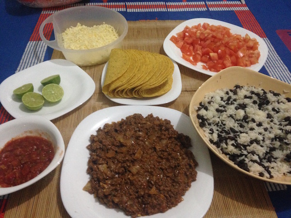 Another night, after finding powdered taco sauce packets and gluten-free taco shells at the American Food Store, Mamie and I teamed up to make faux-Mexican. I believe we also used faux-cheddar as a topping. It tasted surprisingly delicious, but it did not sit well.