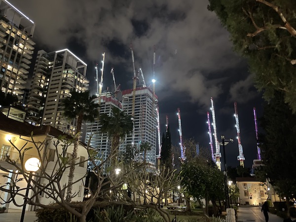 Tel Aviv has become huge and multicultural and it would take weeks to really get a sense of it. I dug back in a few more times before the end of the trip — once when we all went out to dinner in the Sarona neighborhood, in a restaurant in a block of painstakingly restored German Templar buildings from the 1800s surrounded by construction cranes.