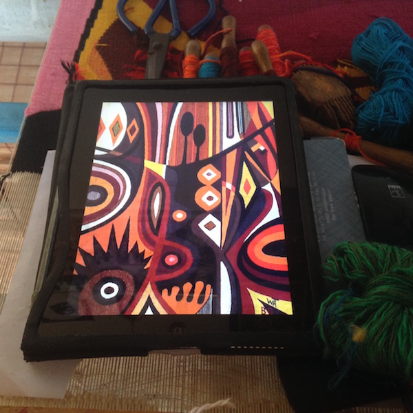 Anyway, I was so taken by the tapestries that I went to the guy who wove them to order my own. I chose a design from among the images on his iPad, but I asked him to change the color scheme and make it mostly greens and pinkish reds.